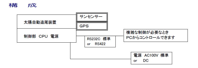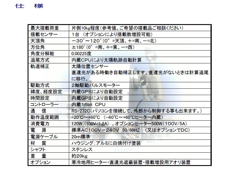 本装置は、直達日射計やサンフォトメーターを搭載し直達光を取り入れる為太陽を自動追尾する装置です。太陽位置センサーを取り付ける事により内蔵CPUで完全自動追尾が可能です。