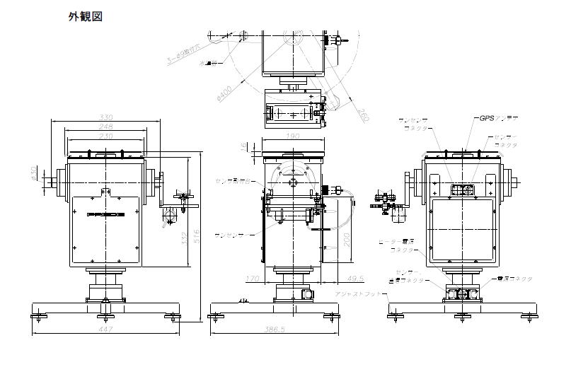 追尾装置本体には搭載品用の中継入出力があり、搭載品のケーブルを追尾装置本体経由として、装置回転時のケーブルの引っかかりを防止することができます。